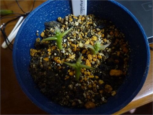 Maihueniopsis archiconoidea (Opuntia archiconoidea)今のところ3つが発芽しているんですが ひとつ変なのがあります。 双葉じゃなくて三葉になってます。写真手前の子。 サボテンも双子葉植物。写真のように双葉が出るんですが、(サボテンでもそれ以外でも…