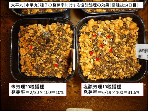 9/15の日記でちらりと塩酸処理を試してみたと書きました。 今月初めにサボテン展示会で貰った太平丸種子(ラベルには「太平丸系混合 水平丸」と書いてある)の発芽率はそのまま播いてもあまりよろしくないらしく、塩酸処理をすると発芽率がUPする。 と実生倶…