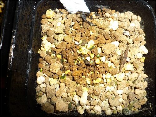 5/14播種のBlossfeldia属のmix。(松露玉というサボテンの属の混合種子) 40粒播いて、4つ発芽。現時点で3つしか残ってません。 ウォーリーを探せ!みたいですね。写真中心に3つあります。 拡大 気温が下がってから、やや乾燥気味にしています。 ちょっとシ…