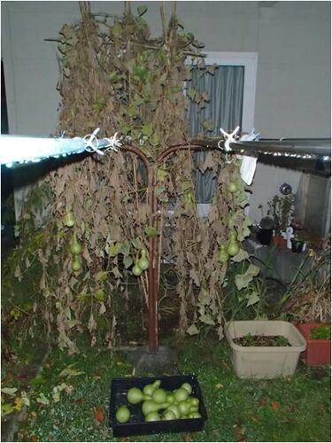 ヒョウタンを収穫して片づけた。 まだ未熟なのがあるが、もうこれ以上は熟してくれないでしょう。 今年の一寸豆ヒョウタン6株からの収穫。 左奥:完熟 右:もうちょっとで完熟だった 左手前:未熟 数はまだ数えてませんが、6株からの収穫量としてはしょぼす…
