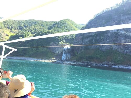 2018/9/15 朝8時 ルシャ湾クルーズを予約していたゴジラ岩観光へ (早めに行かないと好きな席に座れなくなる) 朝8:30出航(2階席の最後尾中央に座れた) カムイワッカの滝を海から見る 温泉の成分で海がここだけエメラルドグリーン 熊を見る 母熊、子熊2頭…